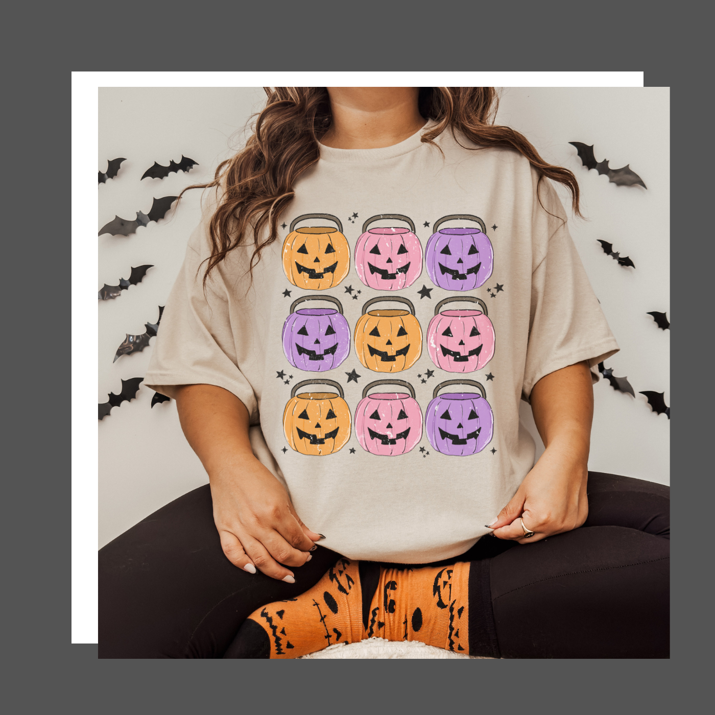 COLORFUL JACKS - Distressed, jackolantern buckets in aesthetic Halloween colors. Girl or boy option.